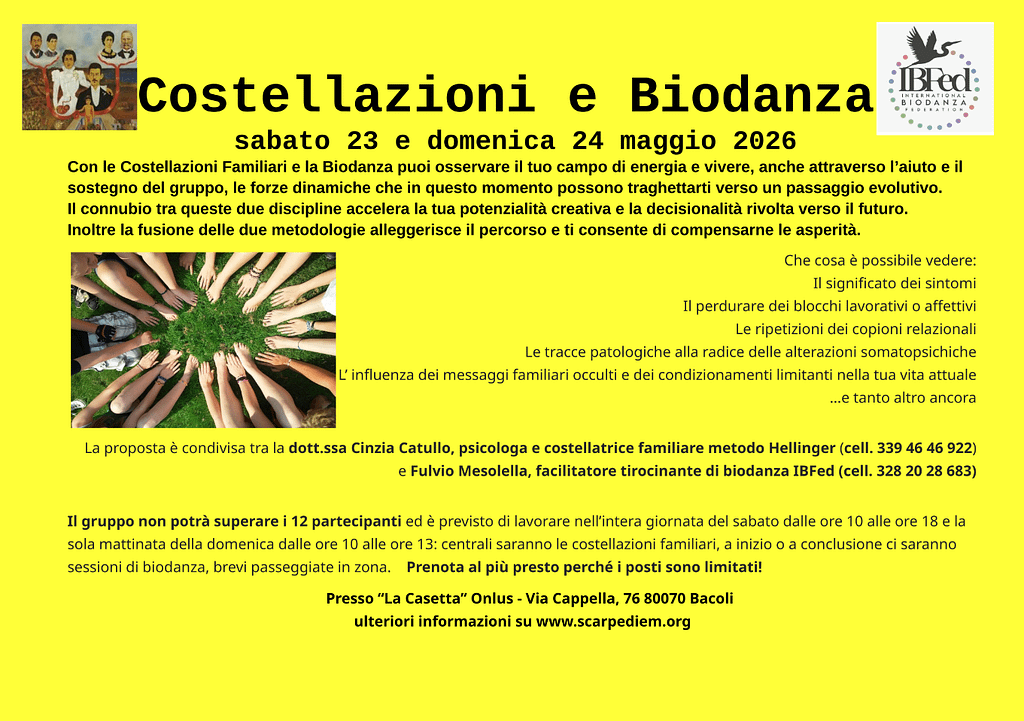 Il gruppo di biodanza di Bagnoli è un gruppo intergenerazionale che va dai 27 agli 80 anni ed è nato a ottobre 2025 consolidandosi molto velocemente anche grazie ad un lavoro di Costellazioni familiari e biodanza realizzato nel dicembre 2025.