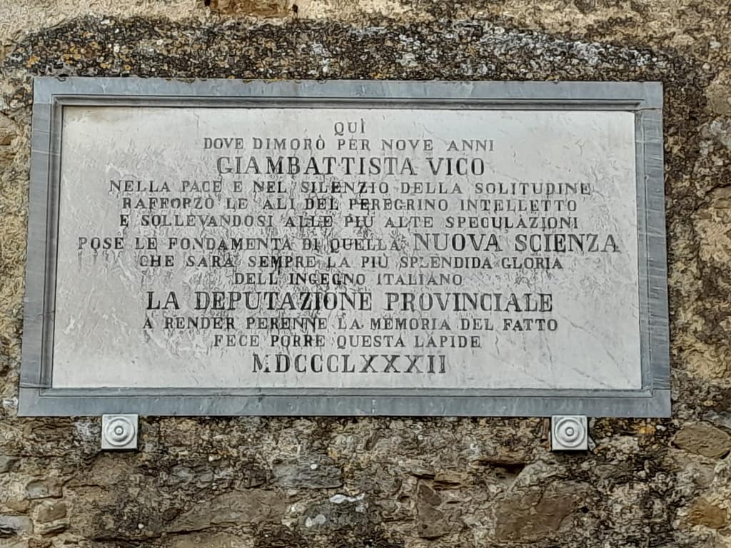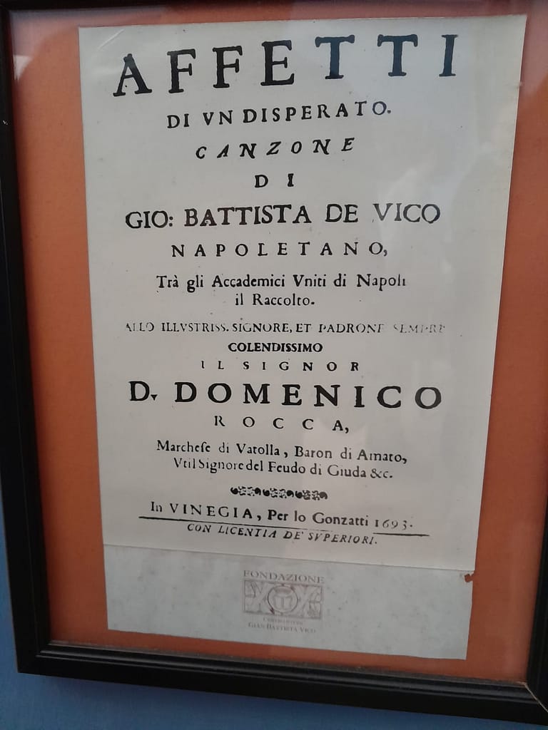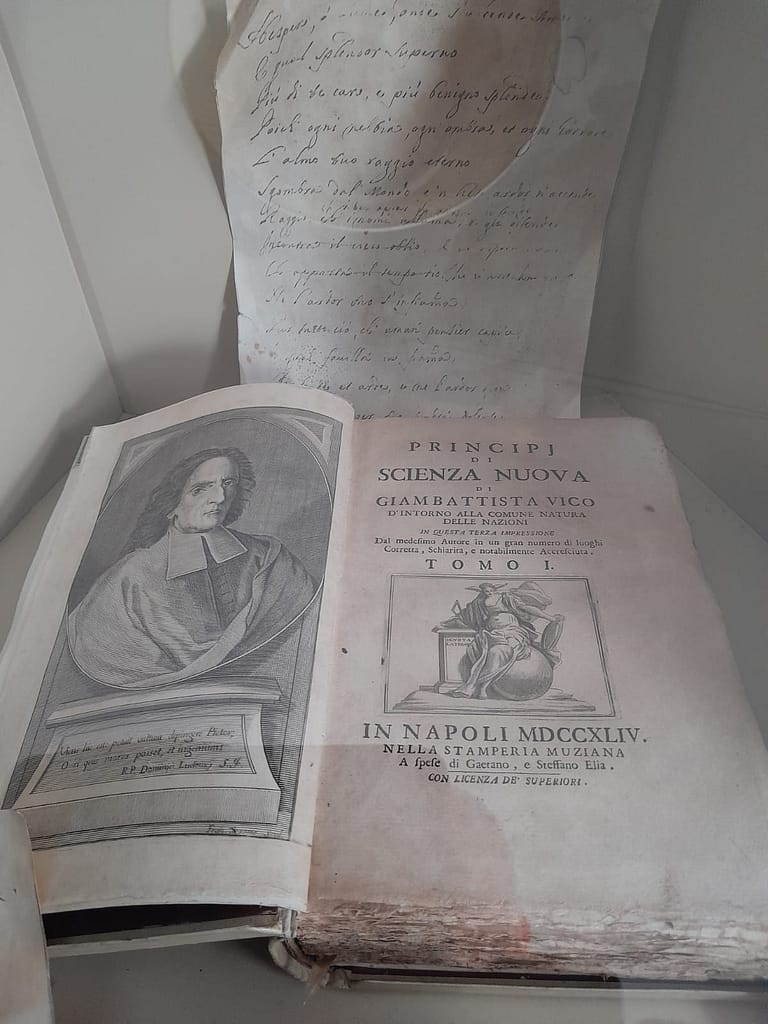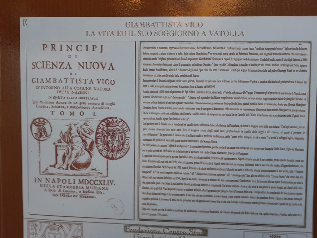 Lapidi che ricordano il passaggio di Giambattista Vico a Vatolla, il cortile del Palazzo de Vargas, un divano dell’epoca. Qui sotto diversi cimeli cartacei, immagini degli interni e della visita guidata