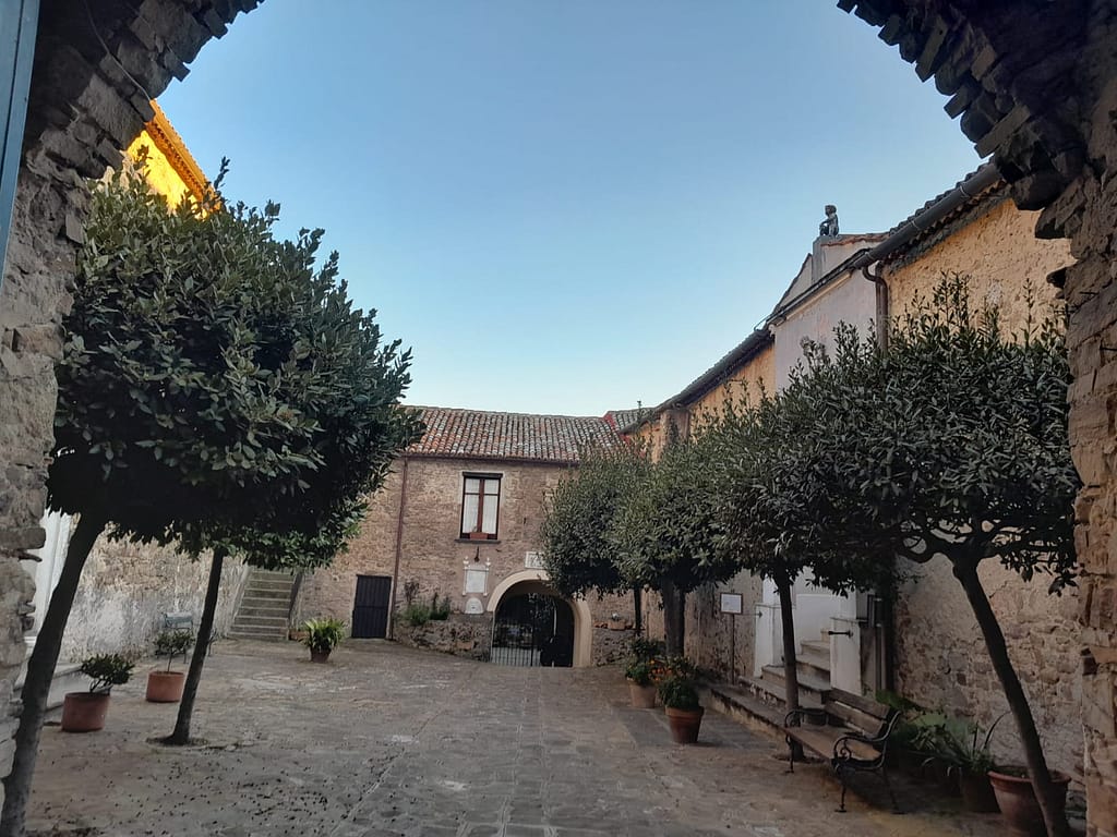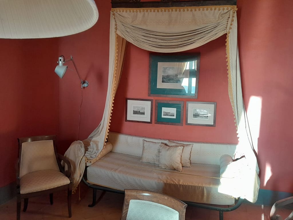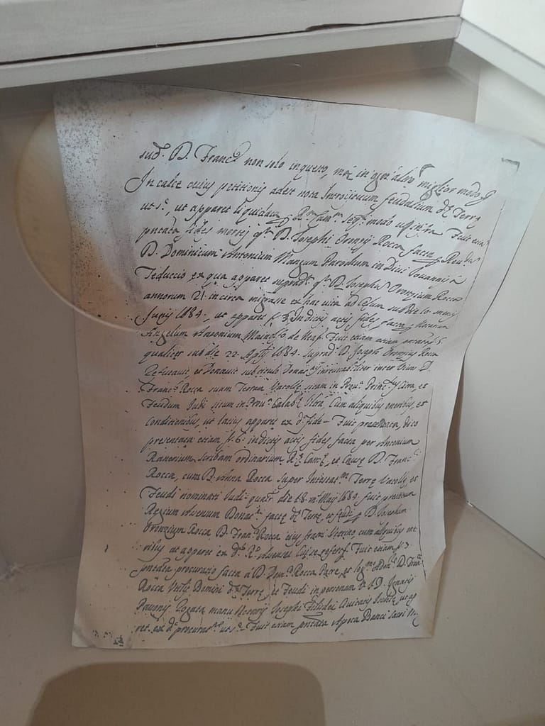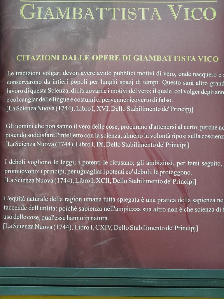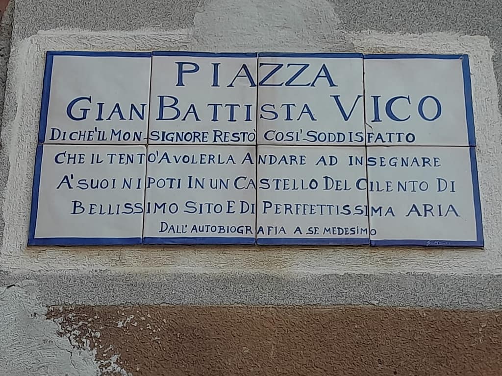 Lapidi che ricordano il passaggio di Giambattista Vico a Vatolla, il cortile del Palazzo de Vargas, un divano dell’epoca. Qui sotto diversi cimeli cartacei, immagini degli interni e della visita guidata