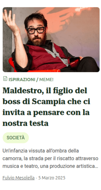 Maldestro è conosciuto come cantante, ma nasce come un ragazzo di Scampia, con la maledizione di essere figlio di un boss e non saperlo nemmeno. Crescendo scopre la musica, ma anche il teatro e diventa un artista del pensiero critico, tuttaltro che maldestro, come si racconta.