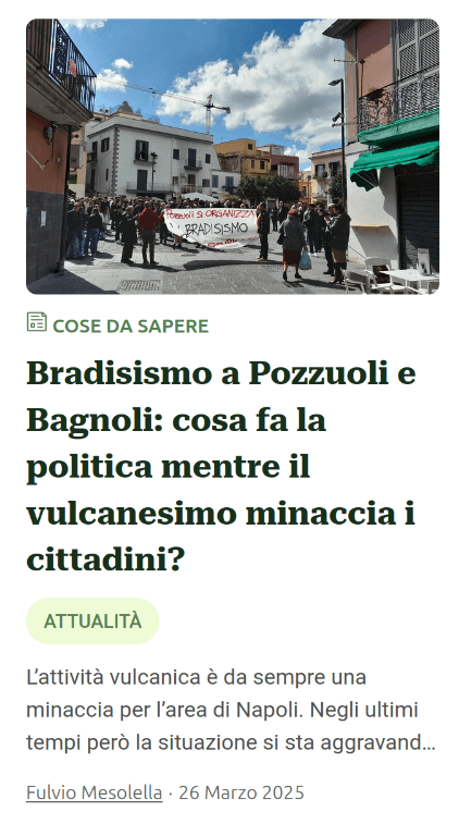 Su questa pagina trovate i miei articoli in ordine inverso di pubblicazione, dall’ultimo al primo, dedicato ai tristi fatti dell’alluvione di Valencia. Mi dedico ai temi del cambiamento a livello personale, sociale, e ambientale, soprattutto in Campania e in Italia meridionale. Vi invito a seguire Italia che cambia anche su facebook, su instagram, sui canali telegram e soprattutto su youtube nella ottima rassegna stampa curata da Andrea Degli Innocenti “io non mi rassegno”, qualcosa di assolutamente incomparabile con i telegiornali offerti dalla sempre più squallida e menzognera televisione italiana e della stampa ad essa accodata, tutti insieme avvelenati dalla propaganda di guerra, dalla sudditanza al pensiero unico governativo.