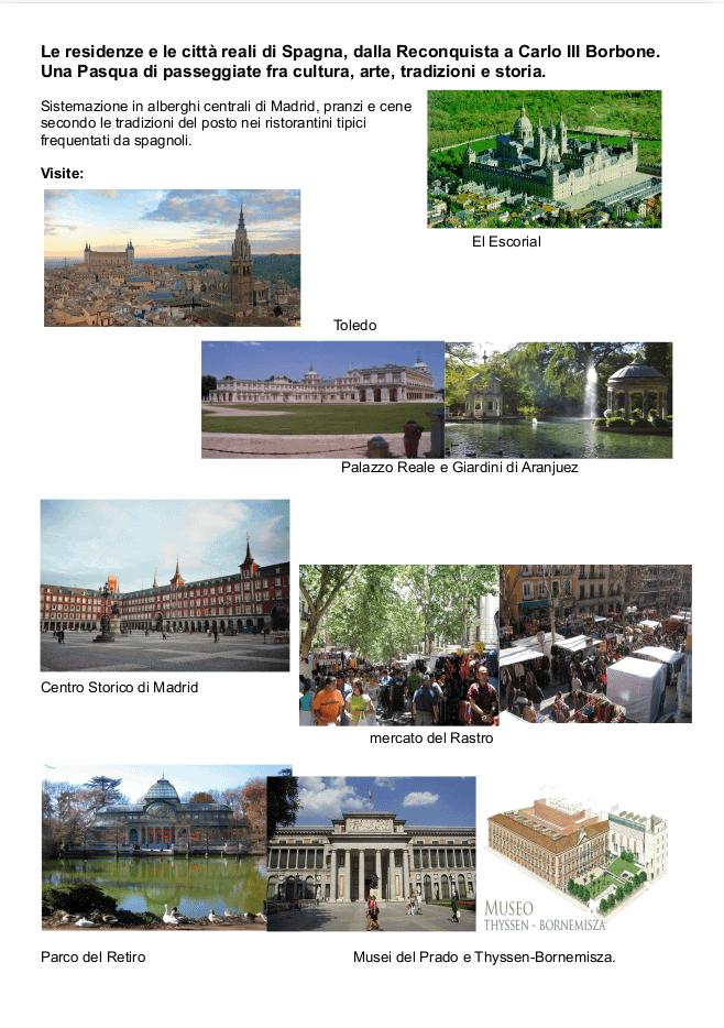 In linea con il proseguimento della proposta sulle relazioni mediterranee e il ruolo della nostra terra in scambio con la Spagna, questa Pasqua visiteremo in gruppo Madrid, Toledo, le residenze reali El Escorial ed Aranjuez.